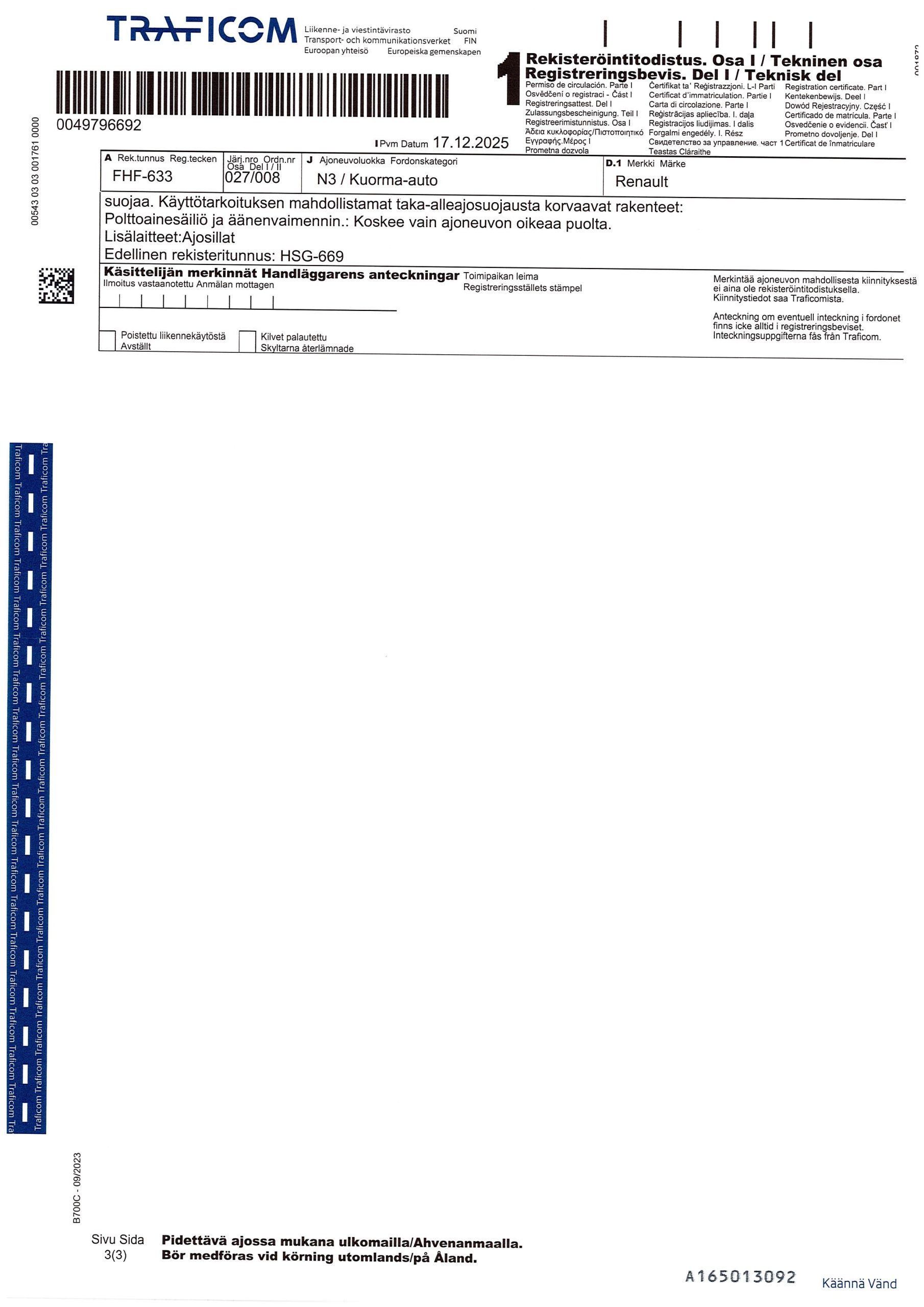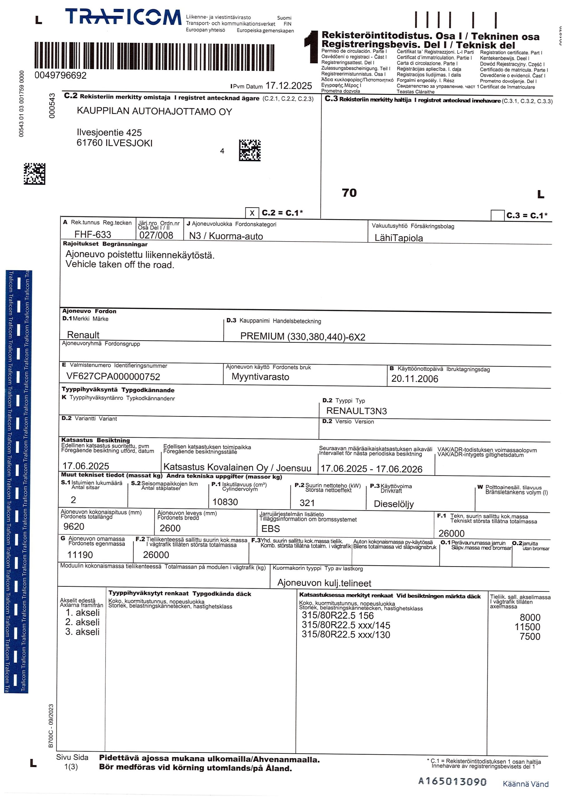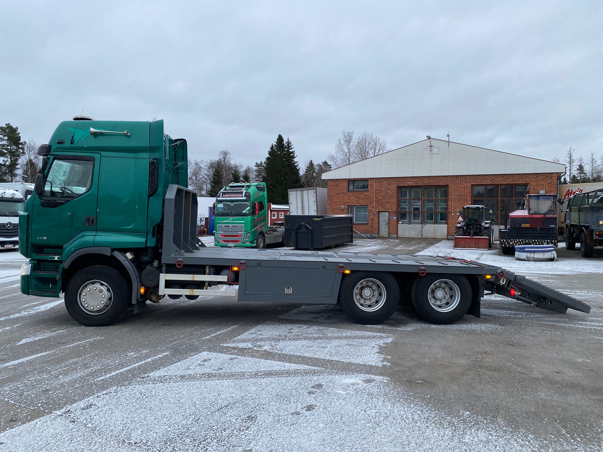 Koneenkuljetusritilä pituus 6,20 m, korkeus 1,18 m, hydrauliramppi, automaattivaihteisto, vesiwebasto, katsastus voimassa 17.06.2026 saakka.