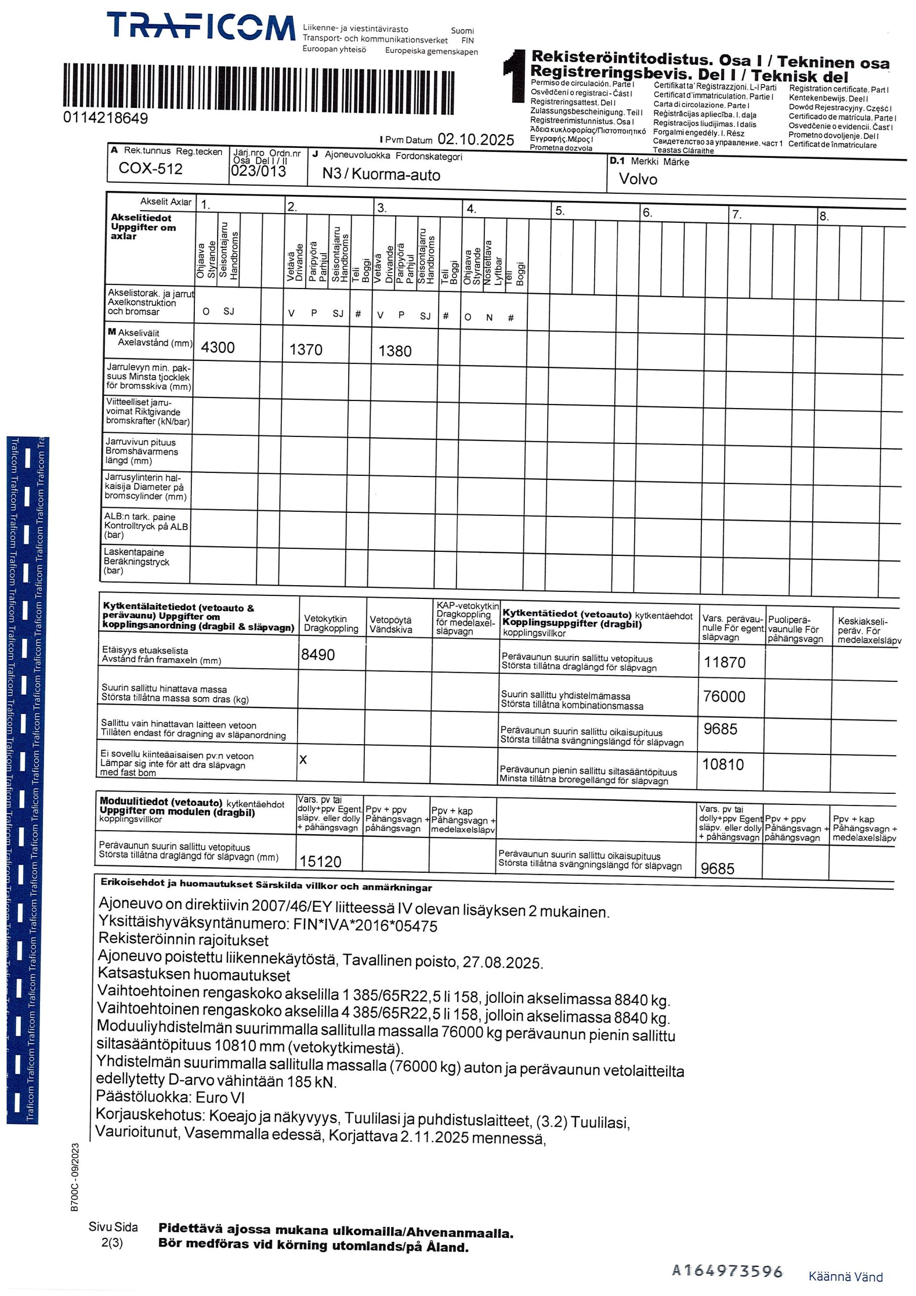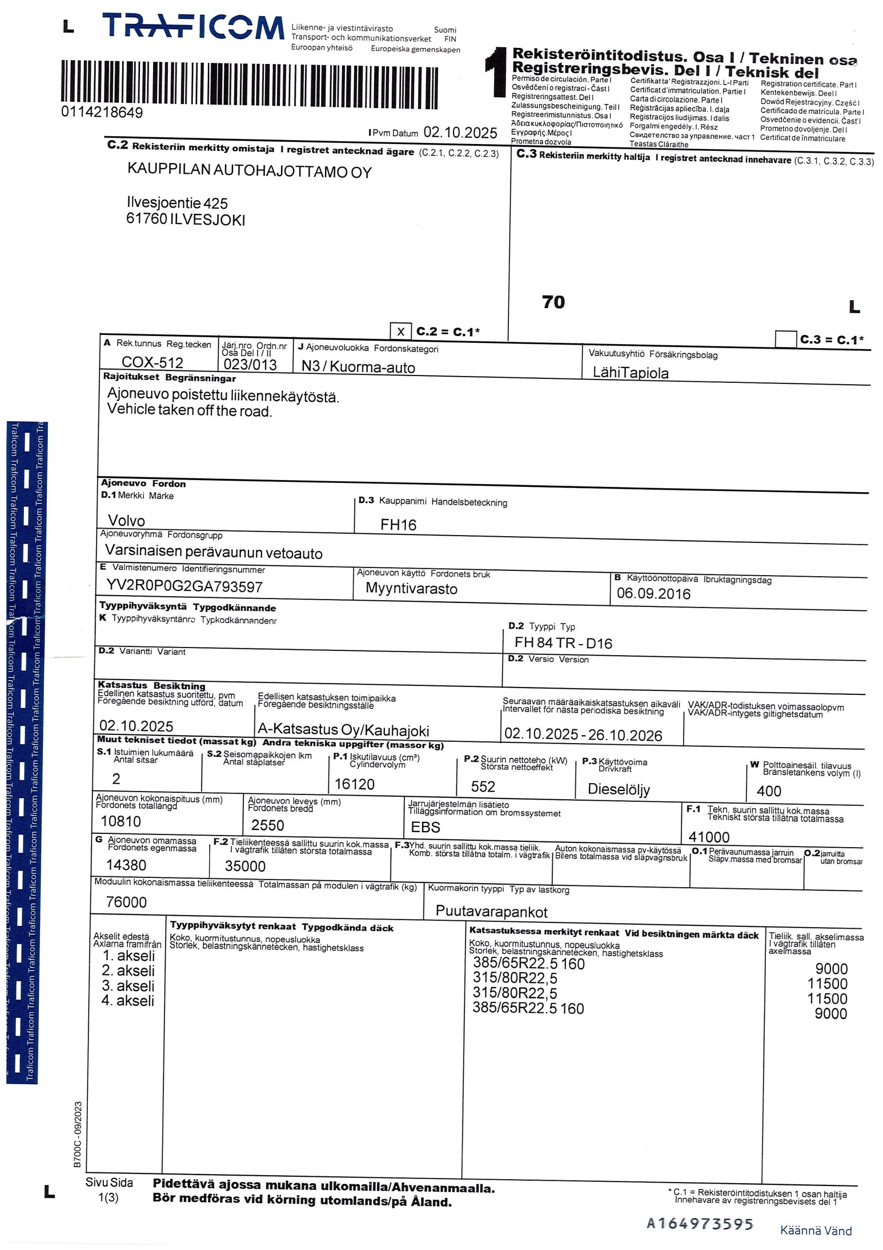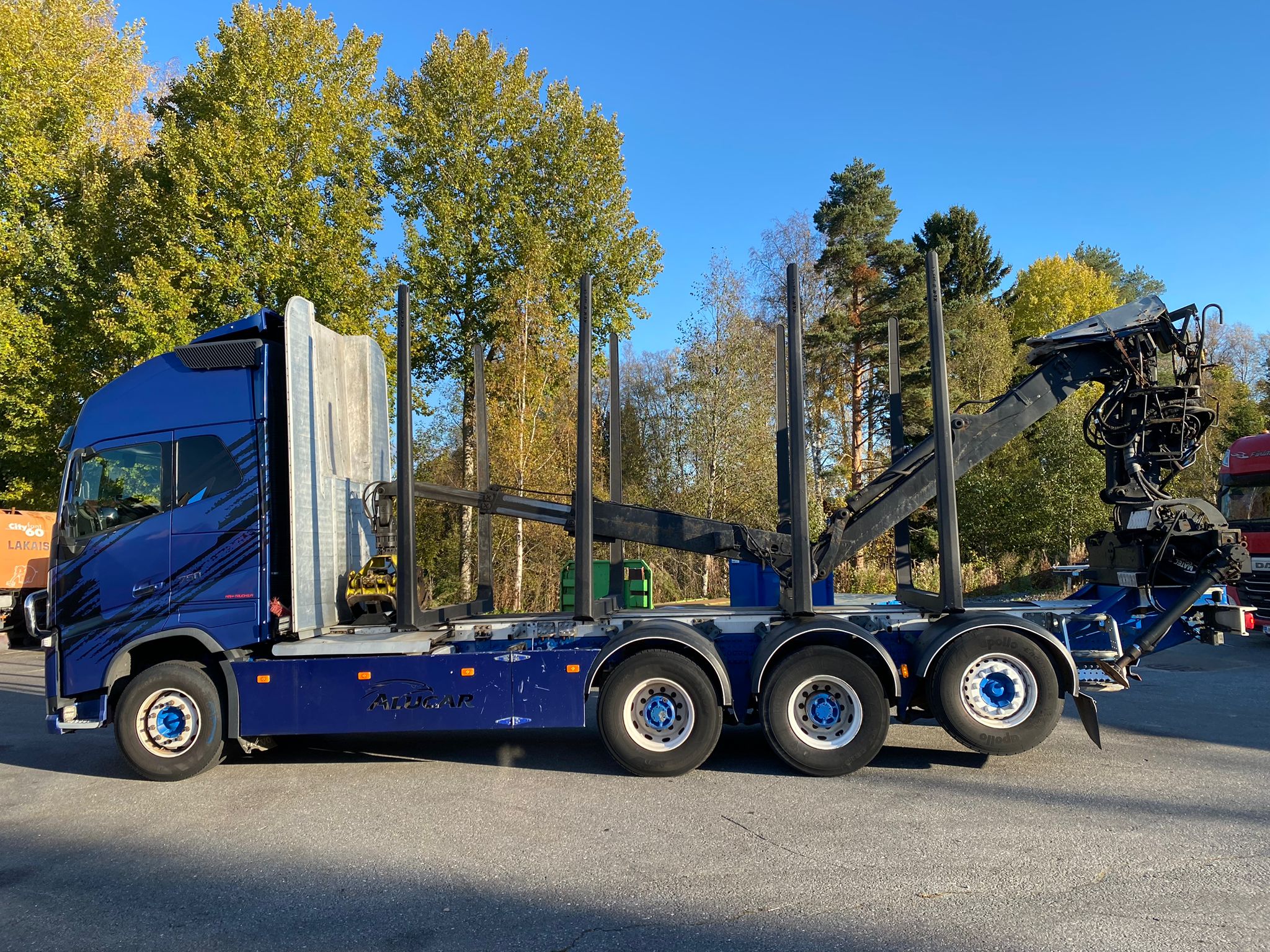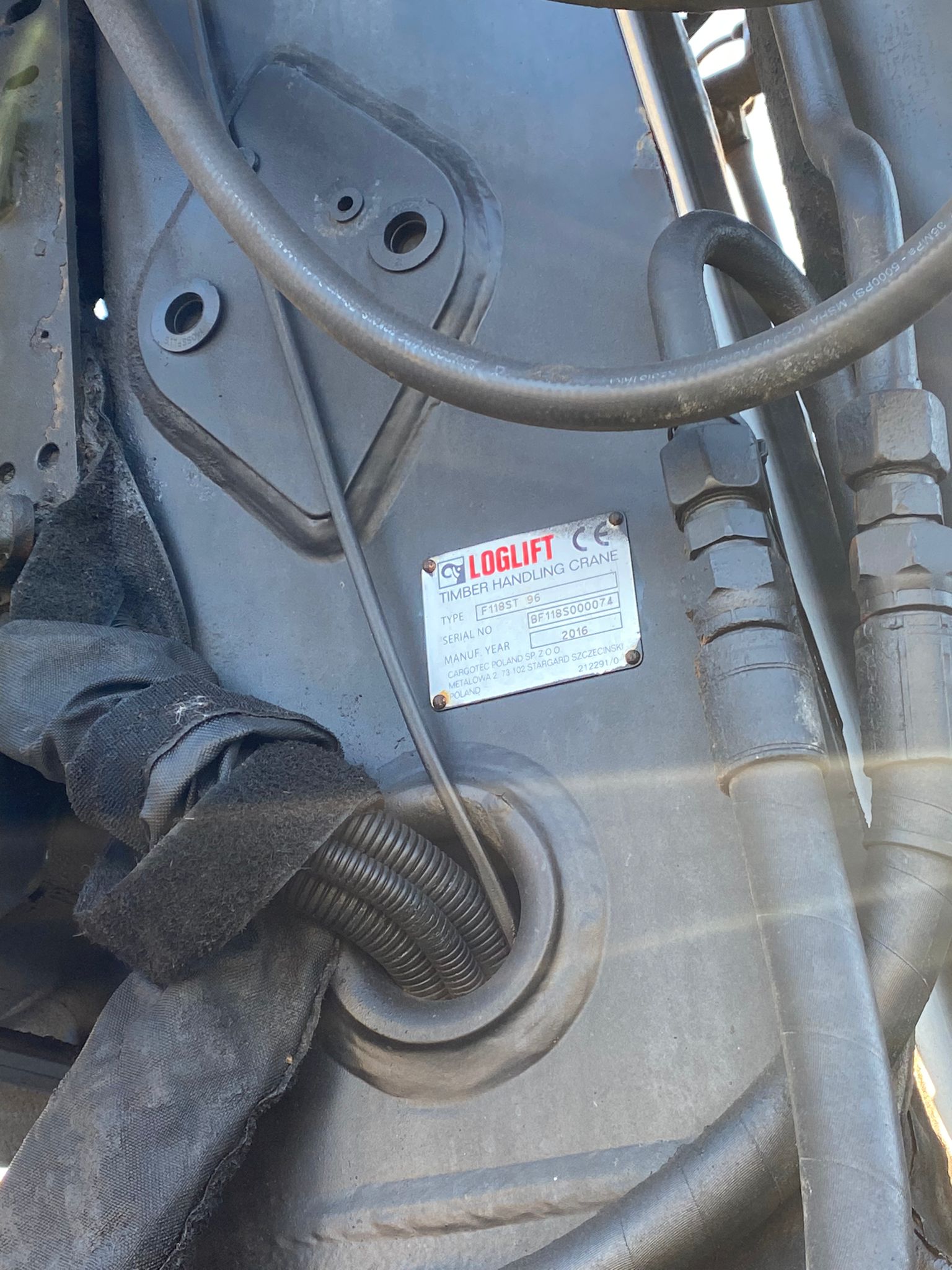 Puutavaravarustus, vetovarustus, jääkaappi, nosturi Loglift F 118 S T 96, vm. 2016, koura ja pyöritin, katsastus voimassa 26.10.2026 saakka.