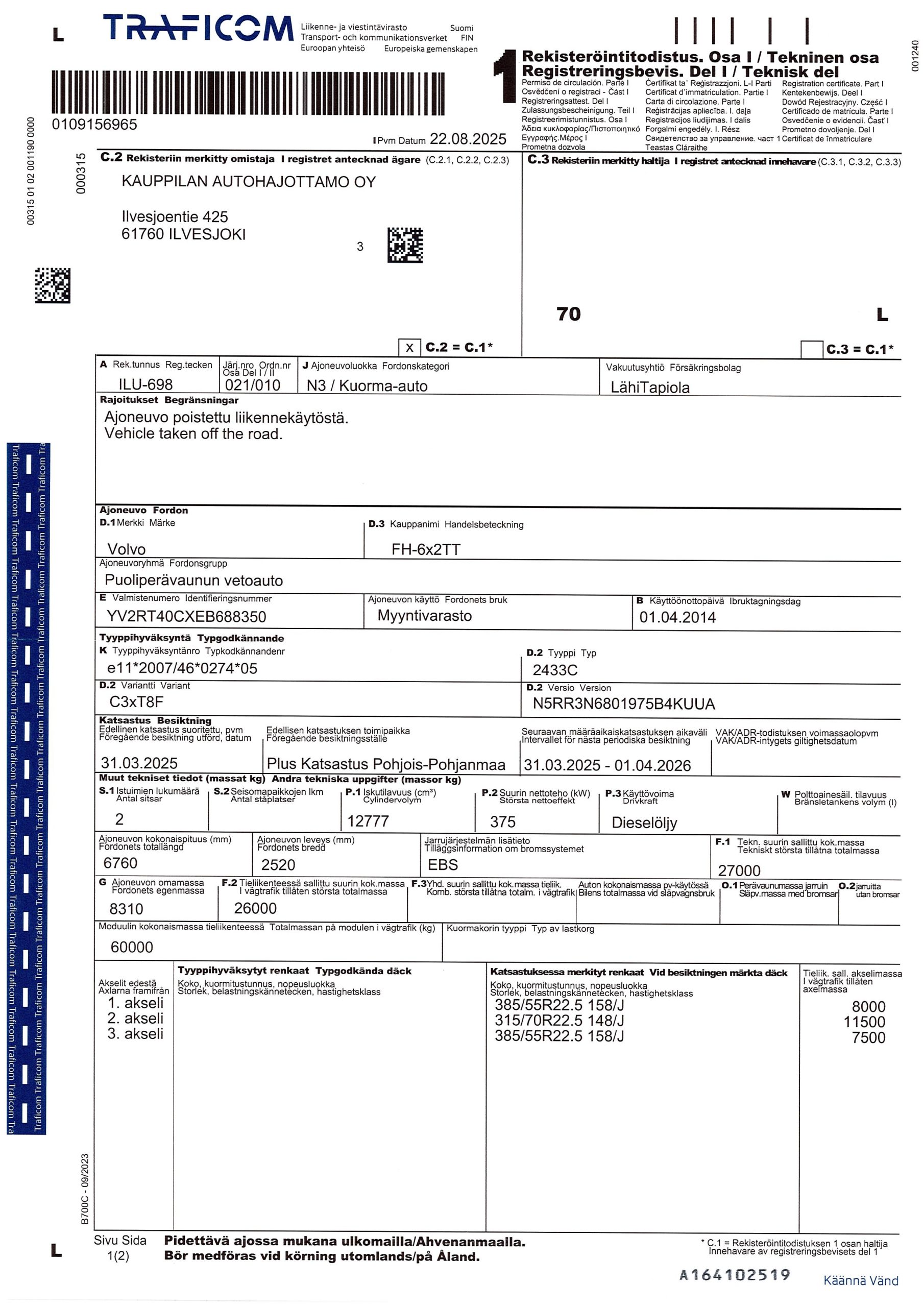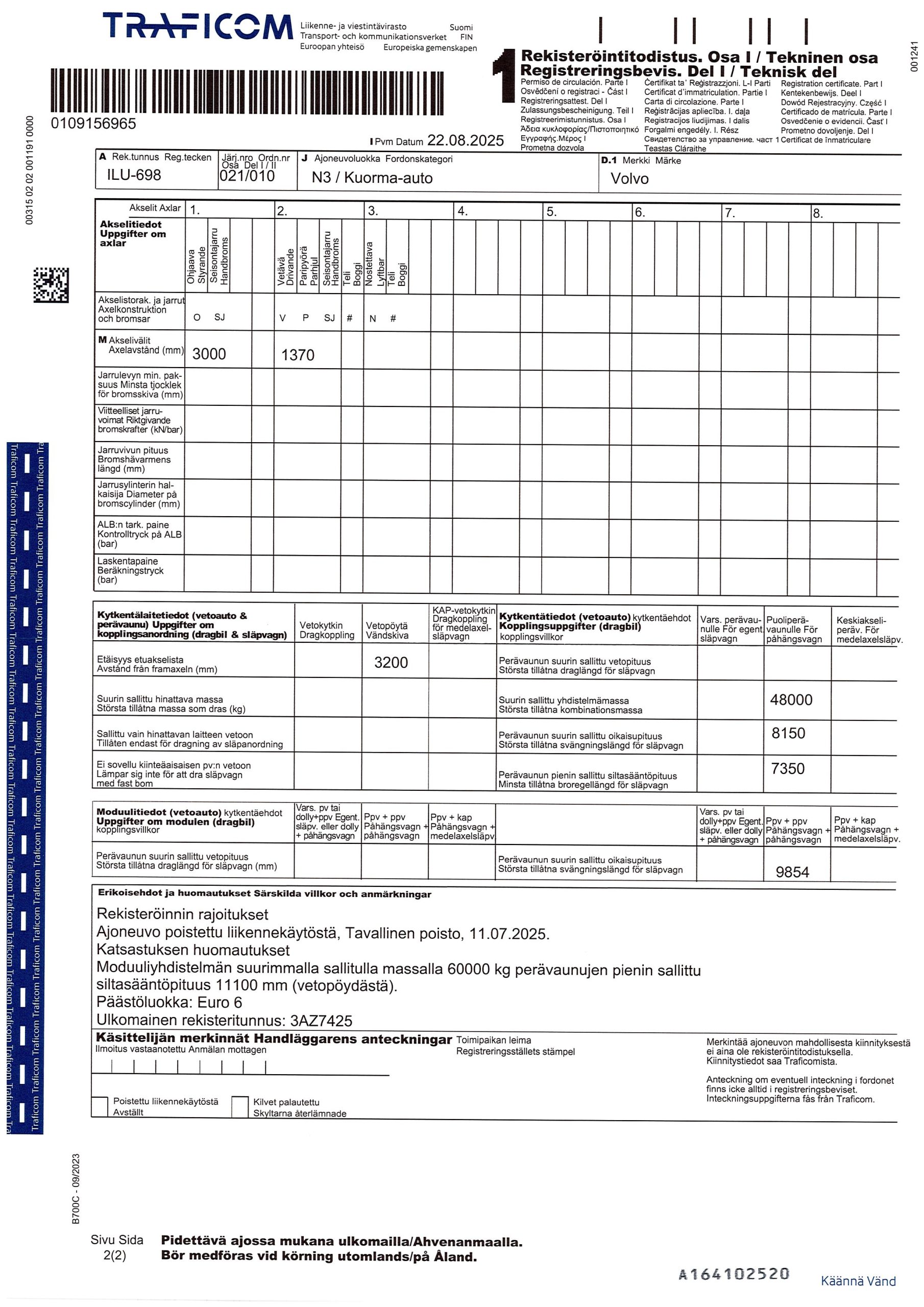 Siirtopöytä, tuulenohjaimet, työvalot, vesiwebasto, I-shift- vaihteisto, jääkaappi, 2x peti, nahkasisusta, katsastus voimassa 1.4.2026 saakka.