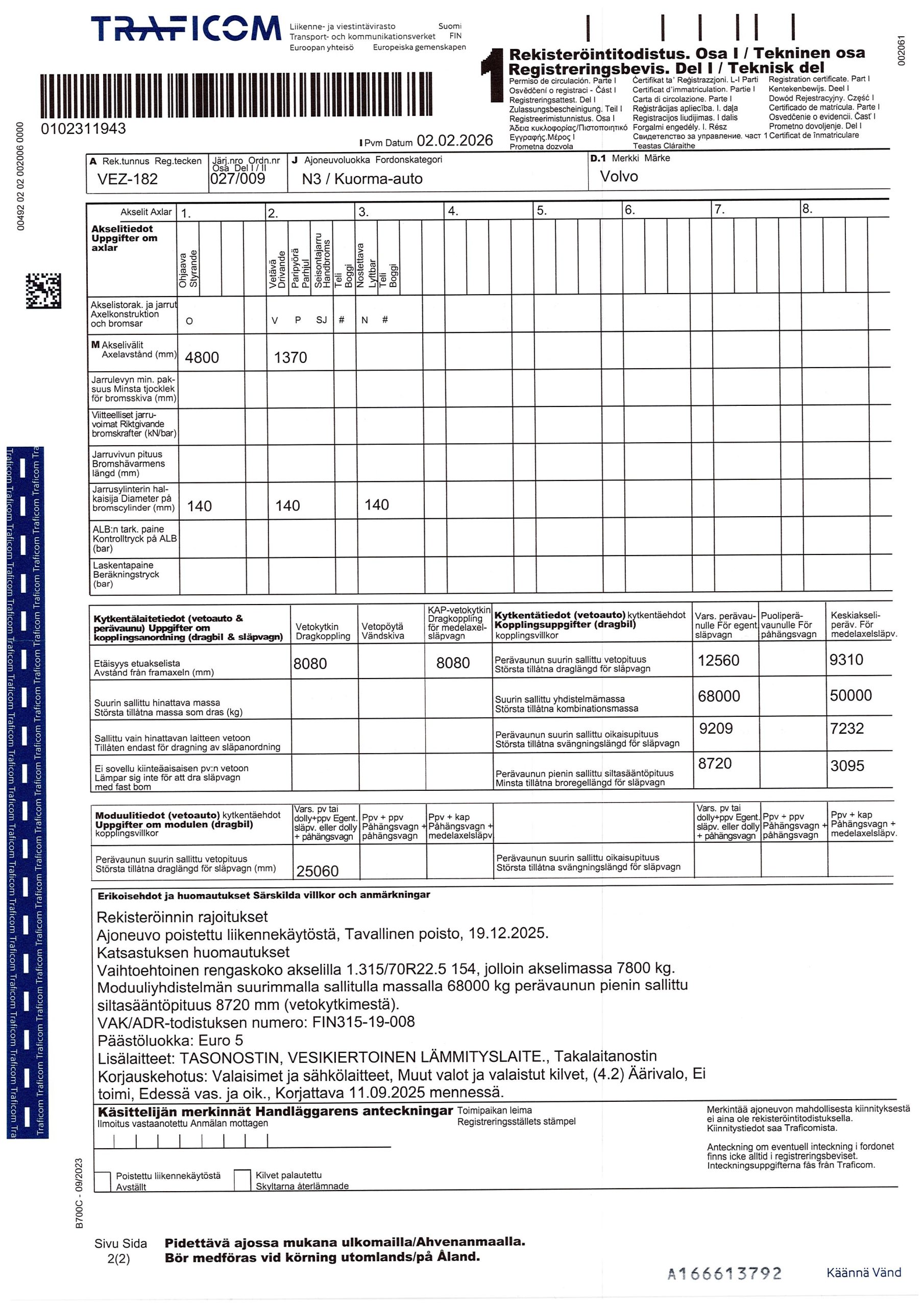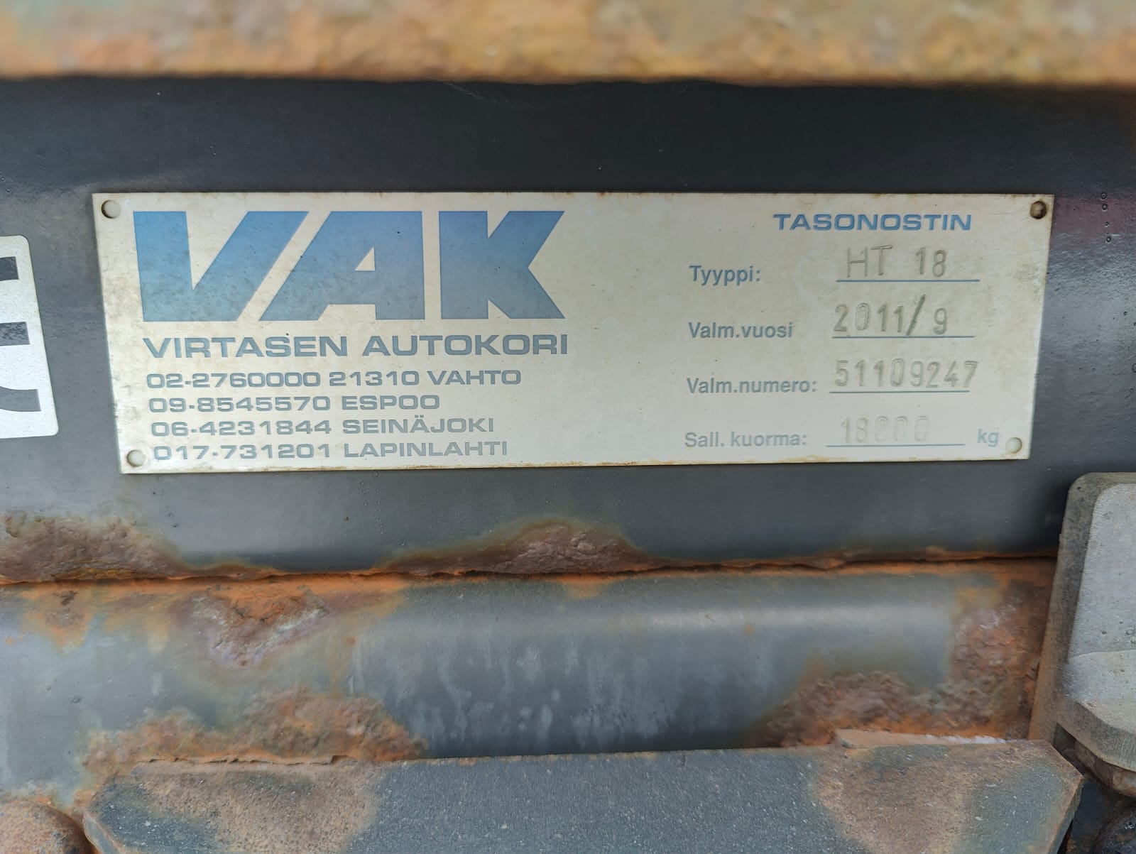 VAK tasonostolaite, pituus 7,50m, ADR-alusta, pl-nostin, TAV-vetovarustus, tuulenohjaimet, I-Shift -vaihteisto, vesiwebasto, katsastus voimassa 11.8.2026 saakka.