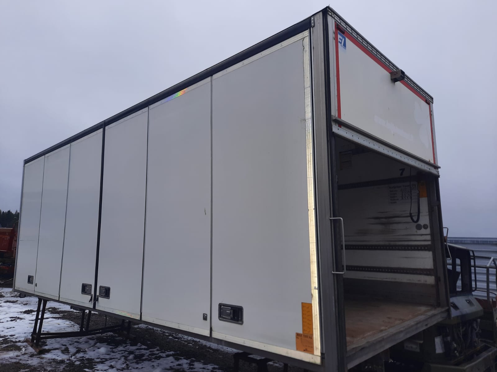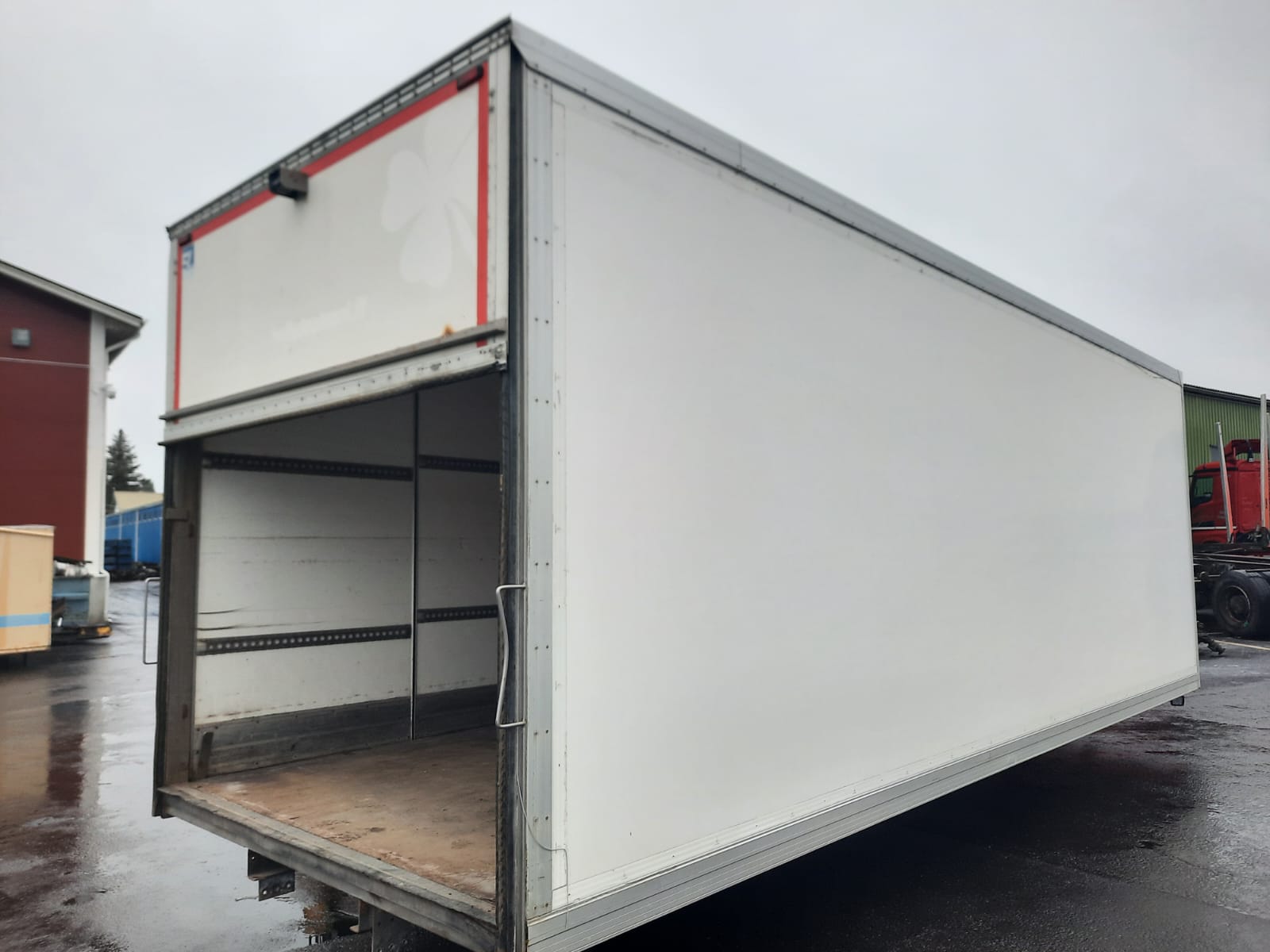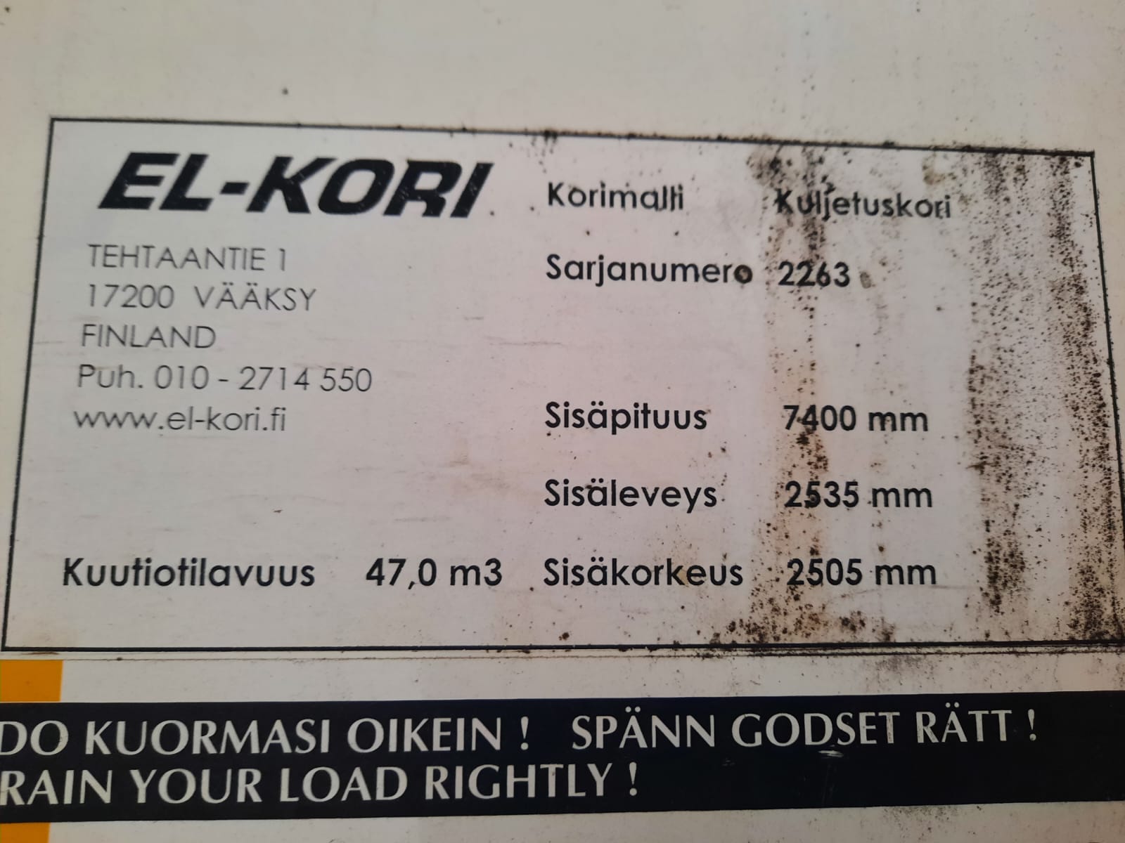 Kokokylkiaukeava kuljetuskori, sisämitat: pit. 7,4m, lev. 2,53m, kork. 2,5m.