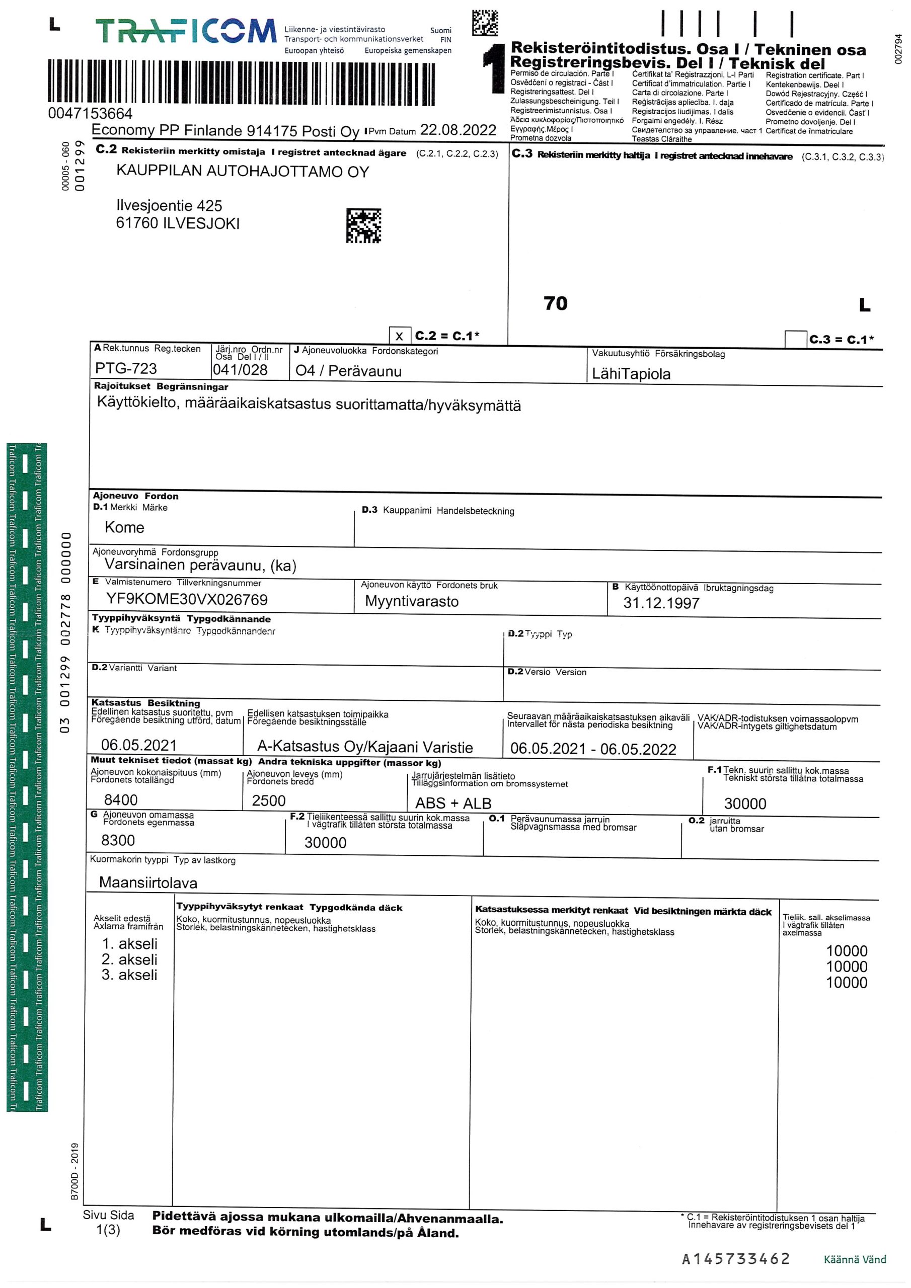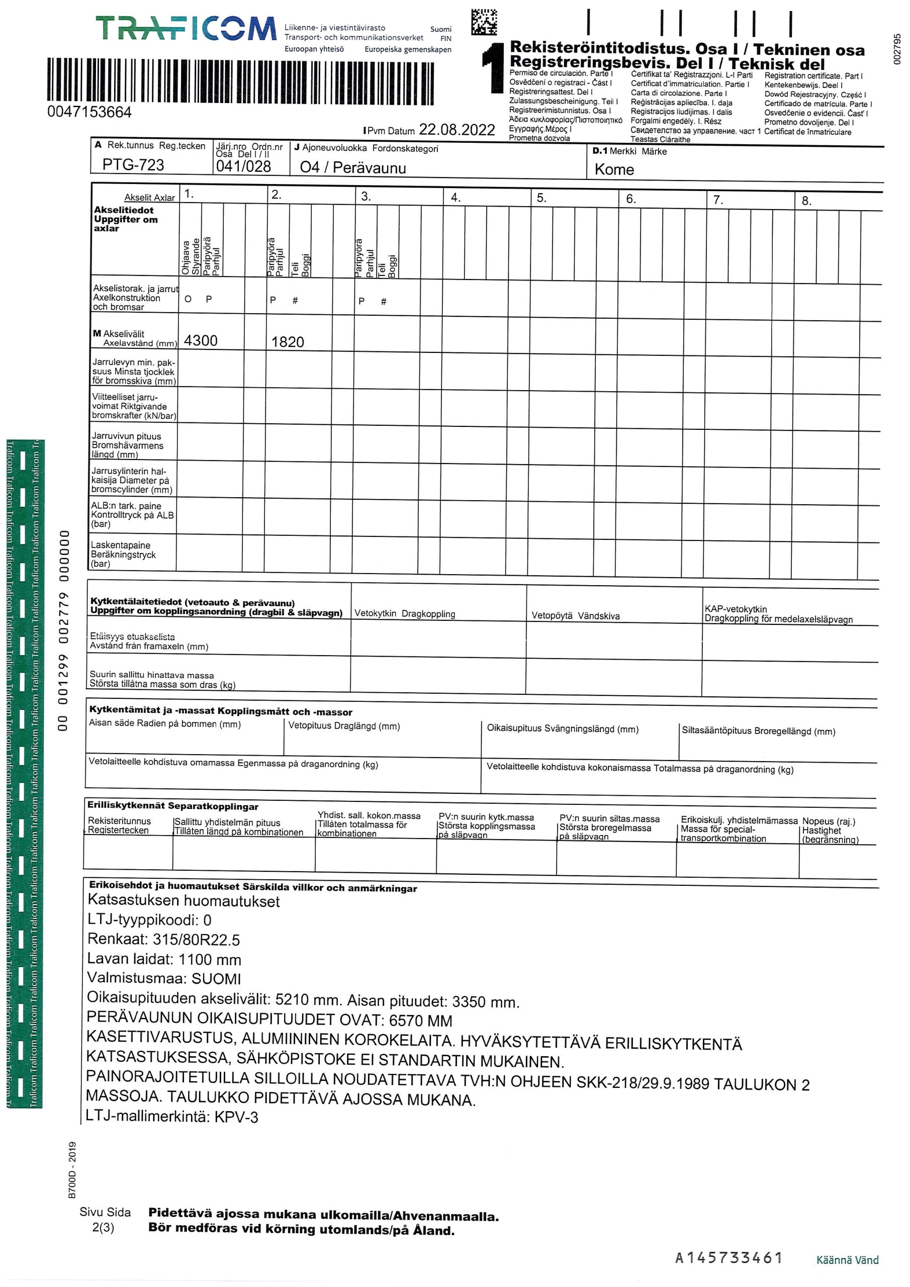 Automaattikasetti, lavan ulkomitat: pituus 6,00 m, leveys 2,20 m, korkeus 1,30 m, SAF-akselit.