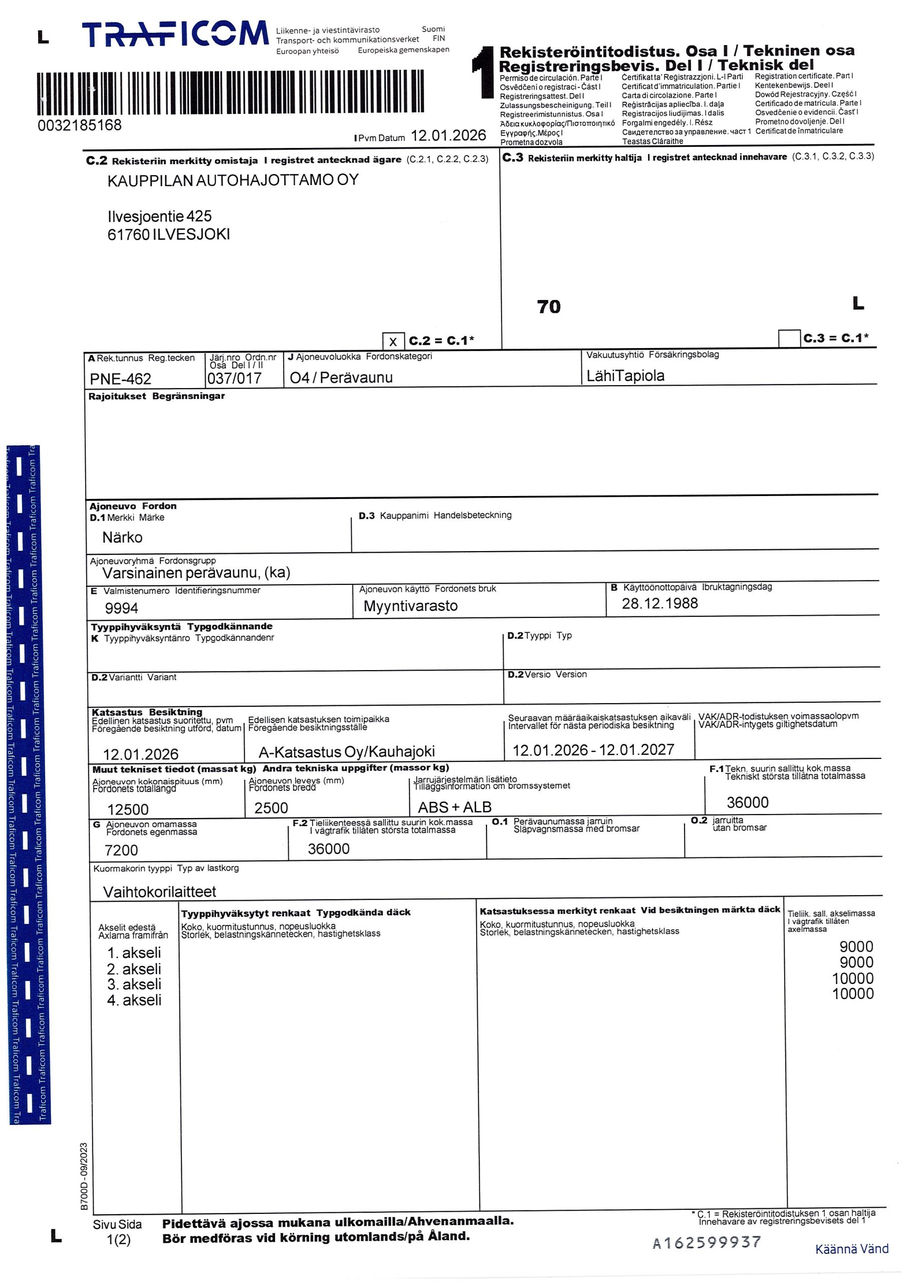 2 lavan vaihtolavaperävaunu, pituus 12,50m, 4x kombilukko, katsastus voimassa 12.1.2027 saakka.