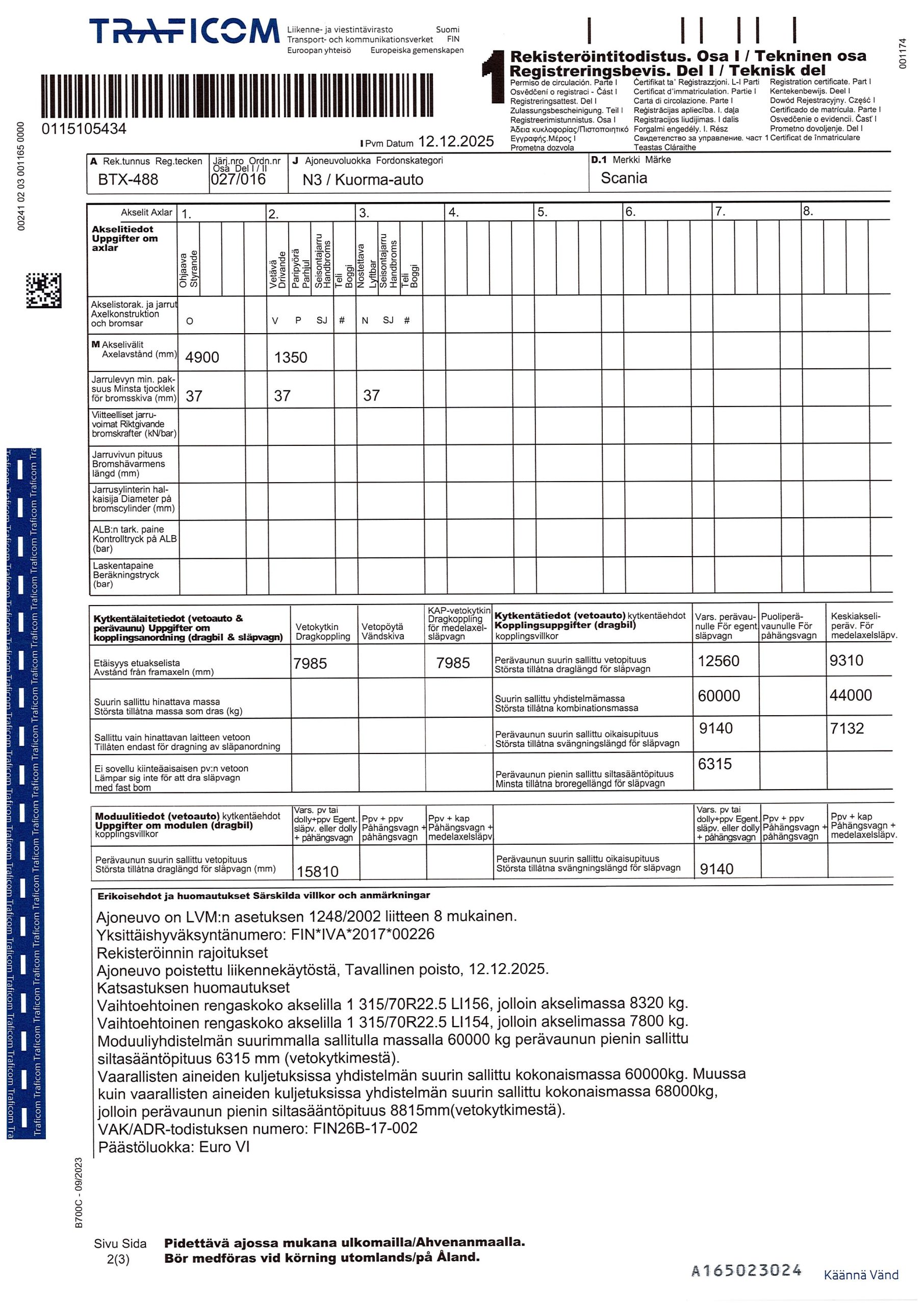 Tasonostolaite Piako, pituus 7,20 m, pl-nostin Zepro 2000 kg, ADR- alusta, vesiwebasto, tuuliohjaimet.